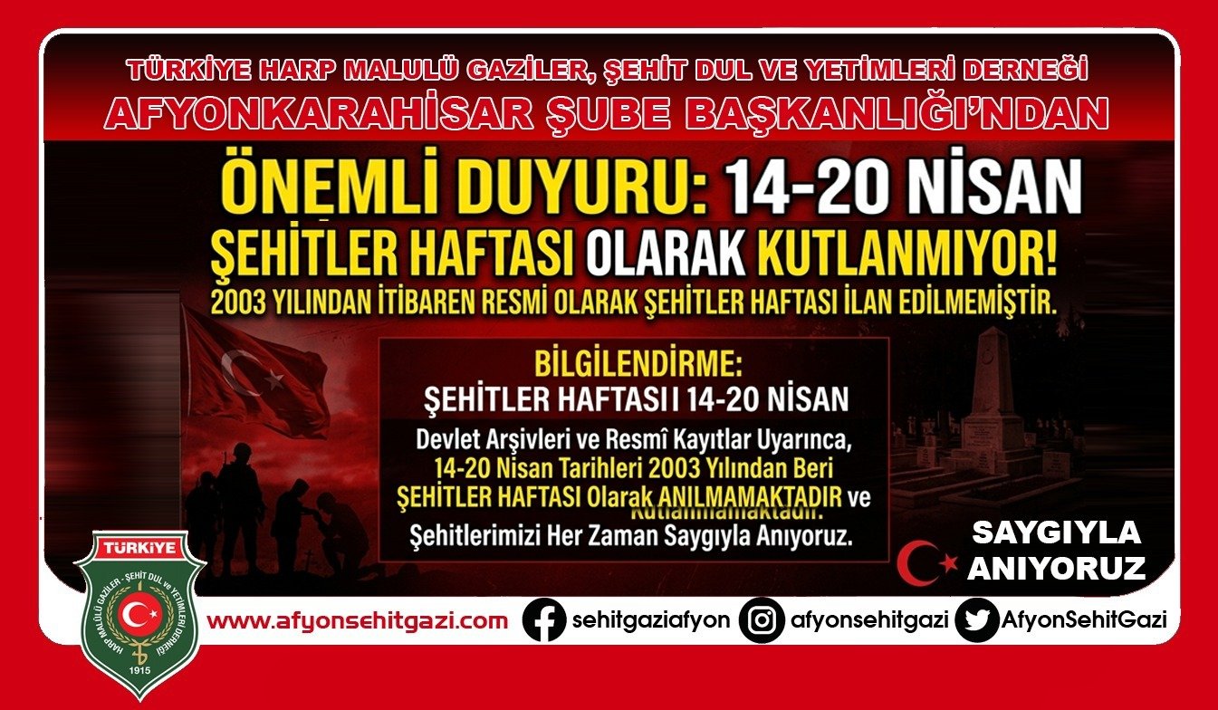 Afyonkarahisar’da şehit aileleri ve gazilerin gür sesi olan İsmail Kumartaşlı, bazı çevrelerin 14-20 Nisan tarihlerini "Şehitler Haftası" olarak anmasına ilişkin önemli hukuki hatırlatmalarda bulundu. Kumartaşlı, 2003 yılında yapılan yasal düzenlemelerle anma günlerinin sadeleştirildiğini belirtti.