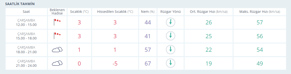 12.00-15.00 saatleri arasında rüzgârlı bir hava etkili olacak. Hava sıcaklığı 3 derece olmakla birlikte hissedilen sıcaklık da 3 derece olacak.