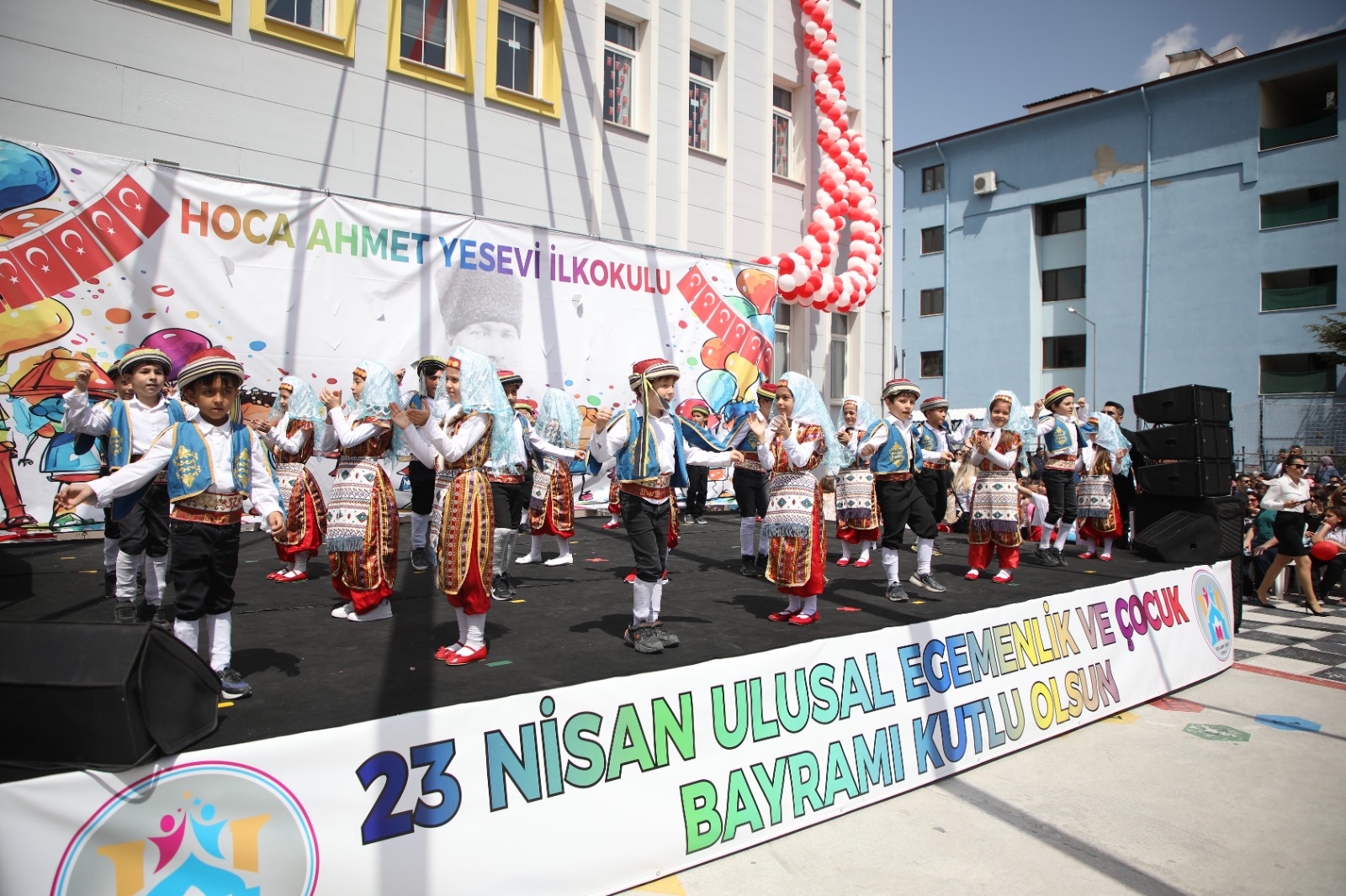 Hoca Ahmet Yesevi İlkokulu’ndaki 23 Nisan Ulusal Egemenlik ve Çocuk Bayramı kutlamaları çerçevesinde okul bahçesinde Türk Bayrağı dağıtılırken Nasreddin Hoca ve Zafer Bandosu gösterileri büyük alkış aldı.