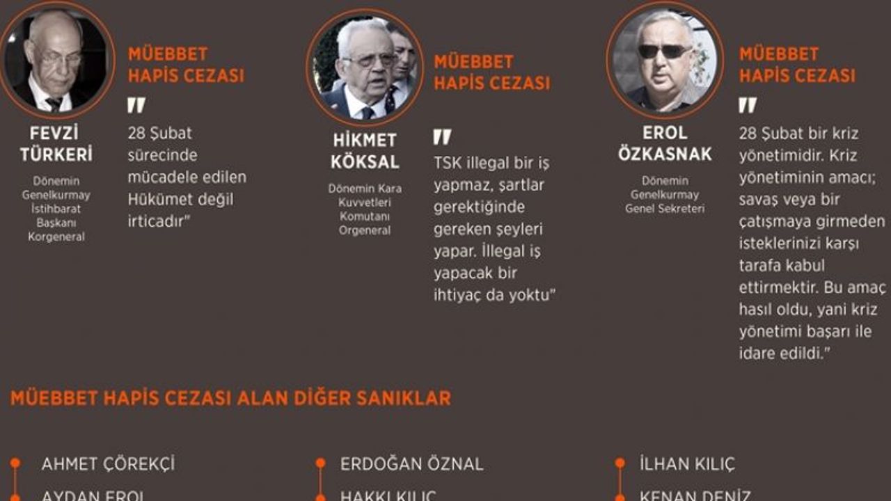 ANKARA (AA) - 28 Şubat davasında 103 sanıktan aralarında dönemin Genelkurmay Başkanı emekli Orgeneral İsmail Hakkı Karadayı, Genelkurmay 2. Başkanı emekli Orgeneral Çevik Bir, Genelkurmay Harekat Başkanı emekli Orgeneral Çetin Doğan ve eski YÖK Başkanı Prof. Dr. Halil Kemal Gürüz'ün de bulunduğu 21'i müebbet hapis cezasına çarptırıldı.