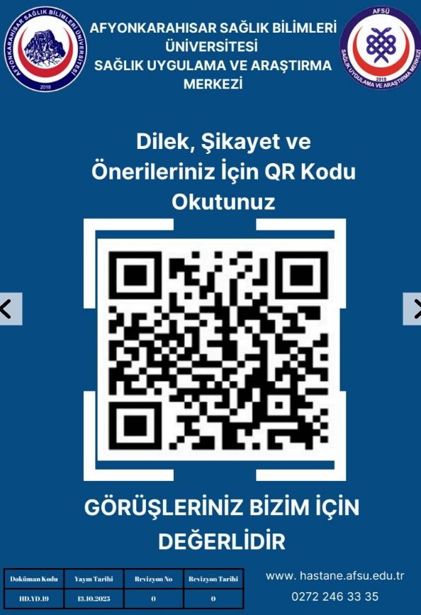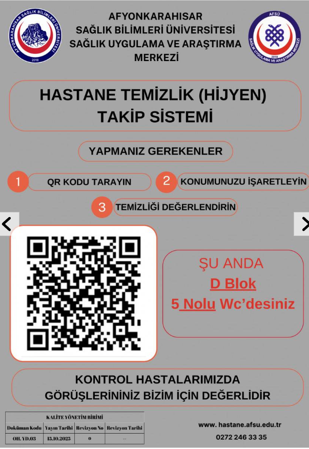 Afyonkarahisar Sağlık Bilimleri Üniversitesi (AFSÜ) Hastanesinde, hasta ve hasta yakınlarının memnuniyetini artırmaya yönelik dijital dönüşüm adımlarına bir yenisi eklendi. AFSÜ Sağlık Uygulama ve Araştırma Merkezi Kalite Yönetimi Birimi tarafından geliştirilen karekod (QR) destekli “İstek ve Şikâyet Bildirim Sistemi” ile “Tuvalet Temizliği Değerlendirme Sistemi” hizmete girdi.