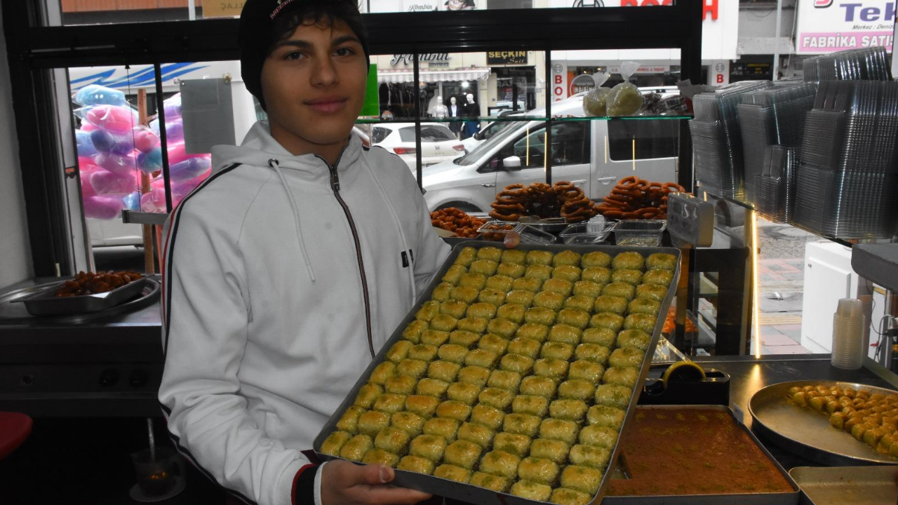 Sayır, “İki yıldır part time olarak iş yerimize geliyor. Böyle gençlerimizin elinden tutmaya çalışıyoruz. Zamanının büyük kısmını okuluna ve sporuna ayırıyor. Kalan zamanlarında ise iş yerimize gelip bizimle çalışıyor. Baklavacılığa da meraklı. Ticareti öğrenmek istiyor.” ifadelerini kullandı.