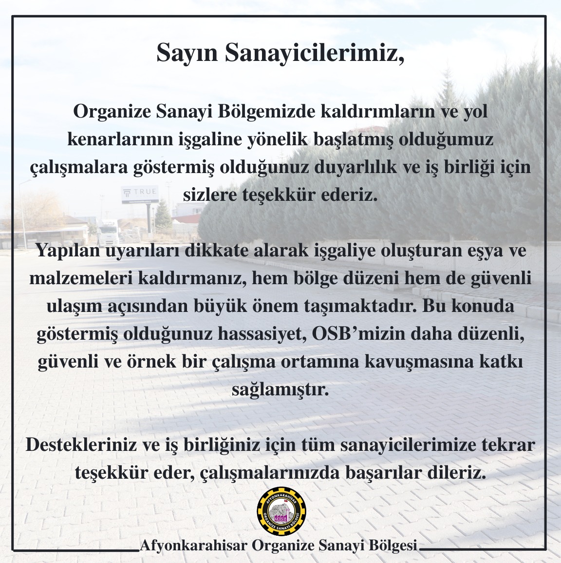 OSB Yönetimi, yapılan uyarılara dikkat edilerek işgaliye oluşturan eşya ve malzemelerin kaldırılmasının, hem bölge düzeni hem de güvenli ulaşım açısından büyük önem taşıdığını vurguladı.
