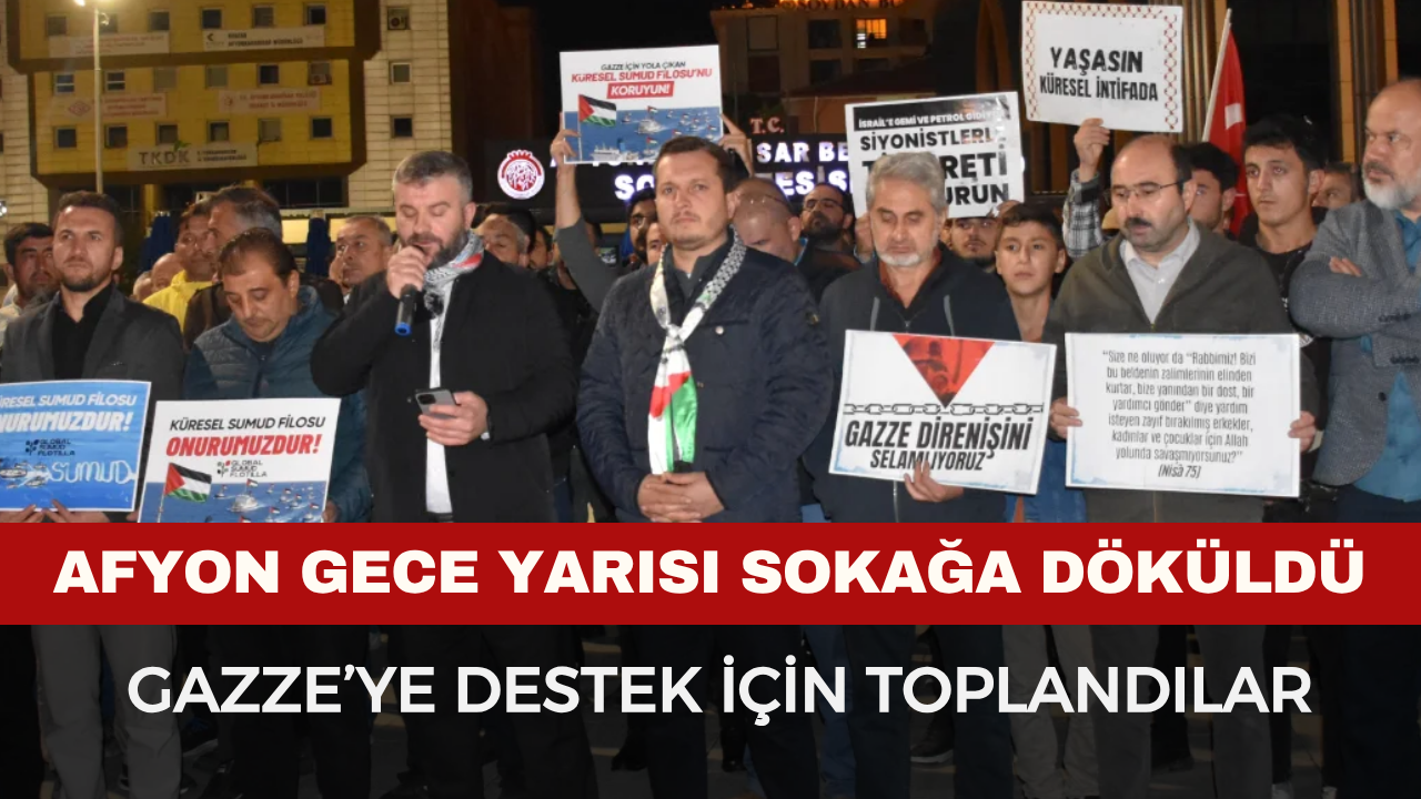 Afyonkarahisar’da, sivil toplum kuruluşu üyeleri ve vatandaşlar, Gazze’ye insani yardım ulaştırmayı amaçlayan Küresel Sumud Filosu’na destek vermek için Zafer Meydanı’nda toplandı. Katılımcılar, ellerinde Türk ve Filistin bayraklarıyla slogan attı.