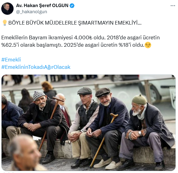 Bunun üzerine İyi Parti Afyonkarahisar Milletvekilli Hakan Şeref Olgun, sosyal medya hesapları üzerinden eleştirel bir paylaşımda bulundu. Olgun, "BÖYLE BÜYÜK MÜJDELERLE ŞIMARTMAYIN EMEKLİYİ... Emeklilerin Bayram ikramiyesi 4.000₺ oldu. 2018’de asgari ücretin %62.5’i olarak başlamıştı. 2025’de asgari ücretin %18’i oldu" ifadelerini kullanarak belirlenen bayram ikramiyesi ücretine tepki gösterdi.