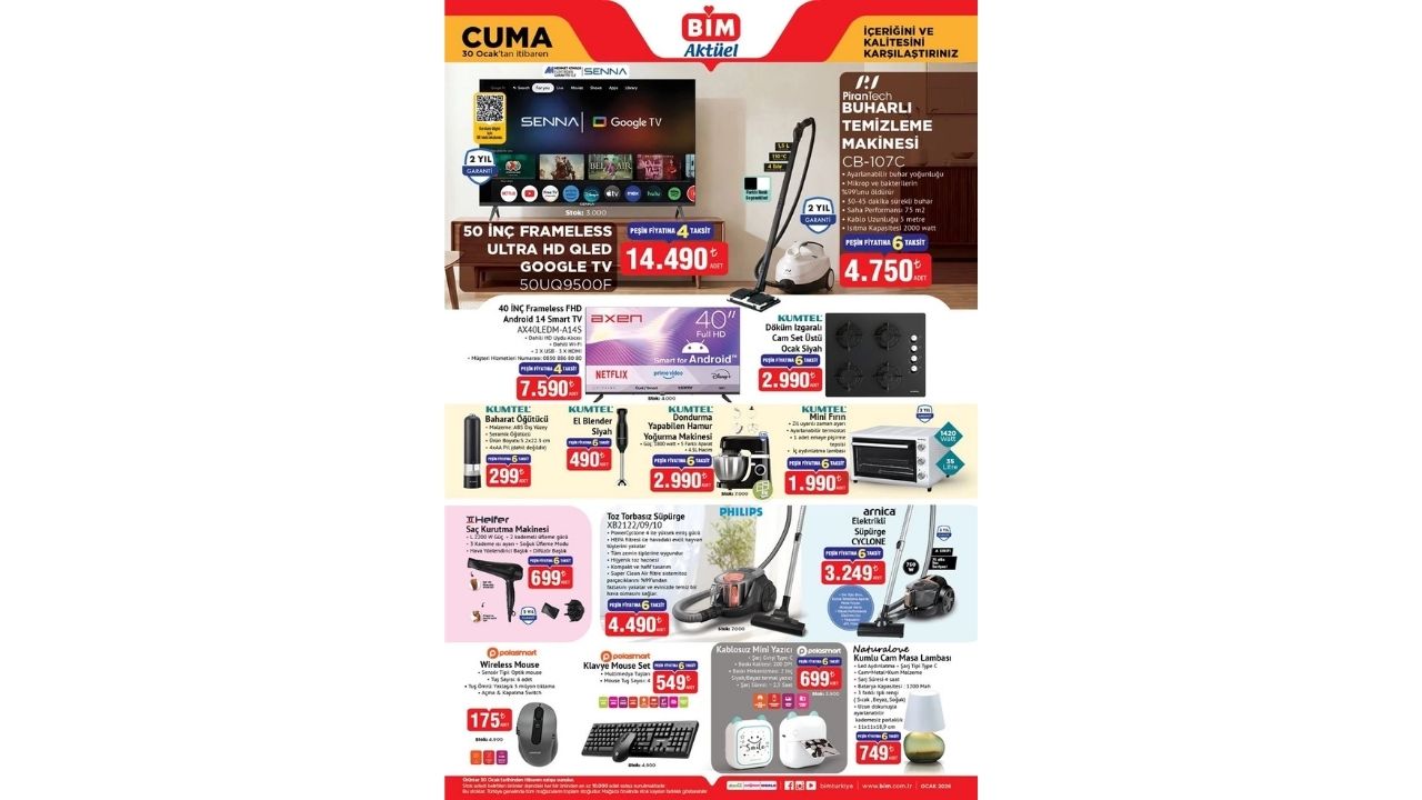 BİM aktüel ürünler kataloğu 30 Ocak 2026 listesinde elektronik ve ev aletleri dikkat çekiyor. Bu hafta öne çıkan ürünler arasında Senna 50 inç Frameless Ultra HD QLED Google TV 14.490 TL, Philips toz torbasız süpürge 4.490 TL ve Arnica elektrikli süpürge 3.249 TL yer alıyor. Ayrıca kablosuz mini yazıcı 699 TL ve kumlu cam masa lambası 749 TL fiyatıyla satışa sunulacak.