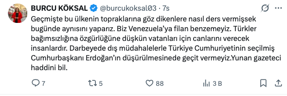 Köksal paylaşımında, Türkiye'nin iç işlerine yönelik dışarıdan gelebilecek müdahale girişimlerini sert bir dille eleştirdi. Türkiye’nin başka ülkelerle kıyaslanamayacağını belirten Köksal, şu ifadeleri kullandı: