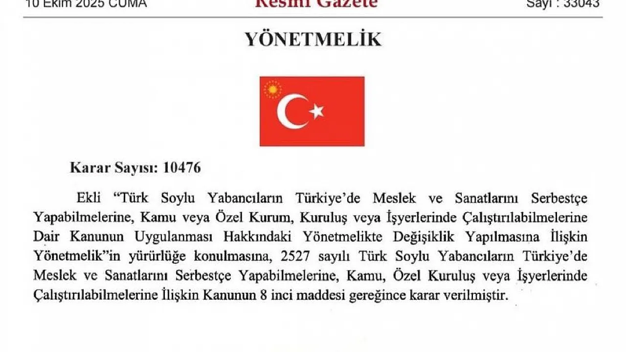 10 Ekim 2025 tarihli Resmî Gazete’de yayımlanan “Türk Soylu Yabancıların Türkiye'de Meslek ve Sanatlarını Serbestçe Yapabilmelerine, Kamu veya Özel Kurum, Kuruluş veya İşyerlerinde Çalıştırılabilmelerine Dair Kanunun Uygulanması Hakkındaki Yönetmelikte Değişiklik Yapılmasına İlişkin Yönetmelik” kapsamında önemli değişiklikler yapıldı.