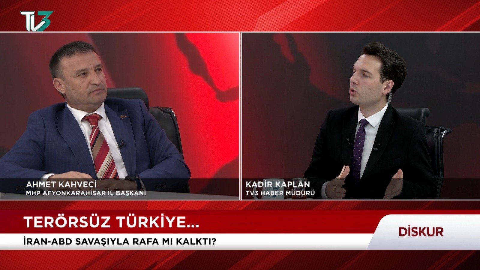 MHP Afyonkarahisar İl Başkanı Ahmet Kahveci, TV3 kanalında yayınlanan Diskur programında, Cumhur İttifakı içerisinde bir çatlak olmadığını, farklı fikirlerin demokratik bir zenginlik olduğunu belirtti. MHP Genel Başkanı Devlet Bahçeli’nin "Terörsüz Türkiye" çıkışını "50 yıllık prangalardan kurtulma projesi" olarak niteleyen Kahveci, belediyelerin borç yüküne rağmen başarılı hizmetler ürettiğini vurguladı. Ayrıca trafik cezalarından sosyal medya denetimine kadar toplumsal pek çok konuda çözüm önerilerini paylaştı.