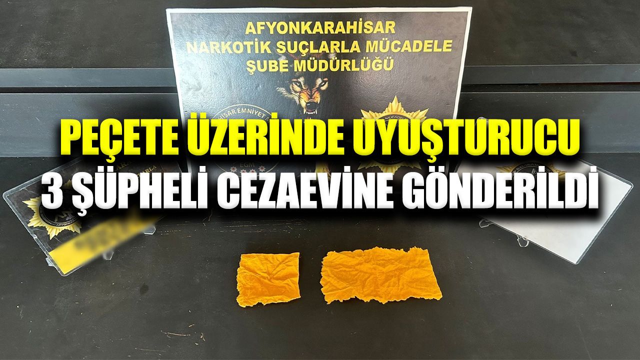 Edinilen bilgilere göre, Afyonkarahisar İl Emniyet Müdürlüğü Narkotik Suçlarla Mücadele Şube Müdürlüğü ekiplerince yürütülen çalışmalar kapsamında H.Y., M.Y. ve A.C.T. isimli şahıslar gözaltına alındı. Şüphelilerin üzerlerinde ve eşyalarında yapılan aramalarda 3 adet uyuşturucu madde emdirilmiş peçete ele geçirildi.